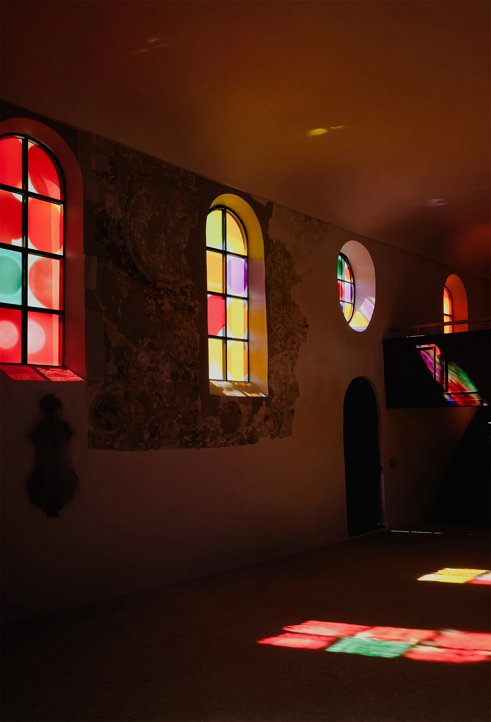Colour harmonies, spatial effects, light influences and the historic church interior were the key factors in the design and development of the windows, which the glass painters worked on using etching techniques according to the artist's instructions. This resulted in harmonious shapes in different shades of colour in the fields, and the artist's windows were inaugurated in October 2020.