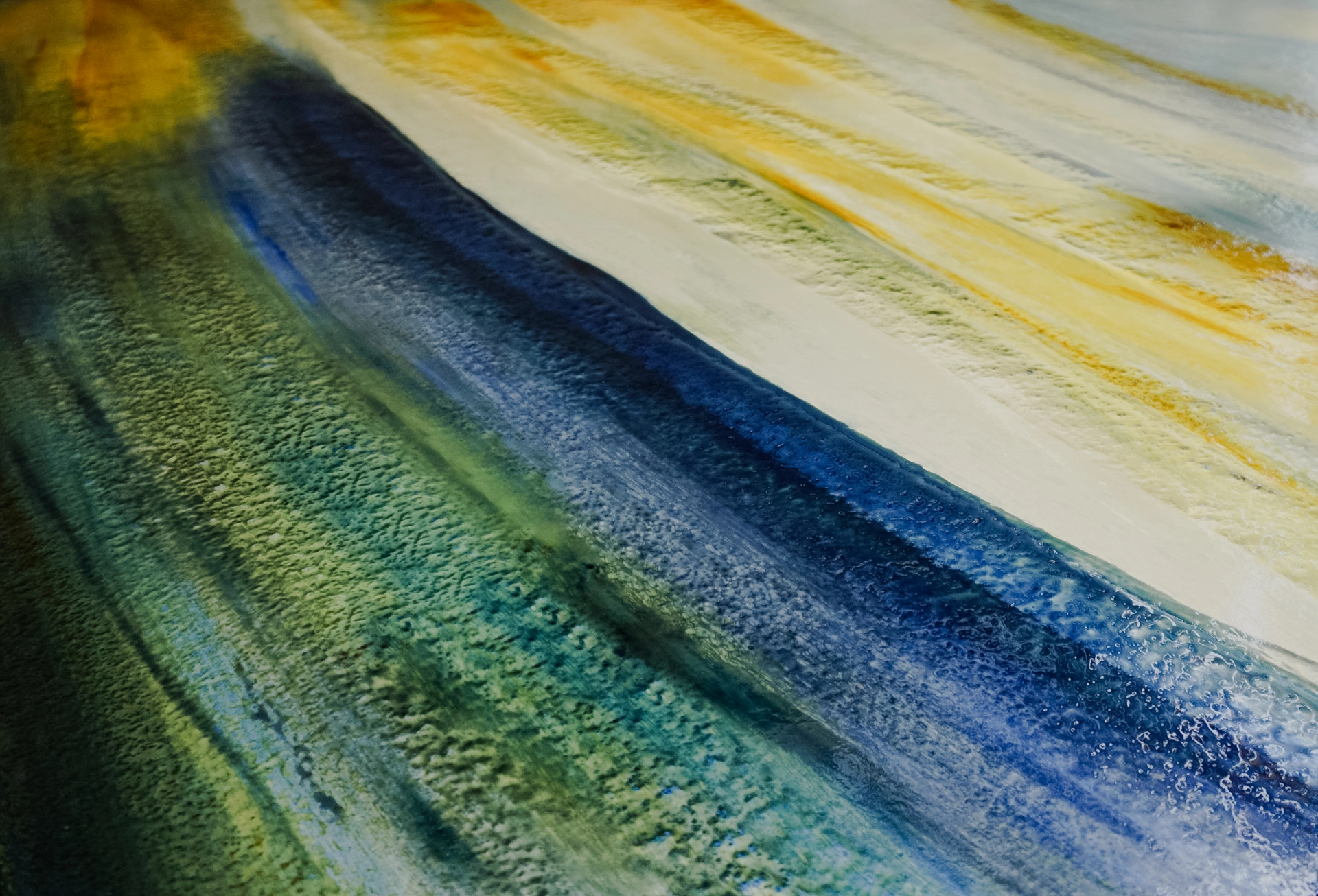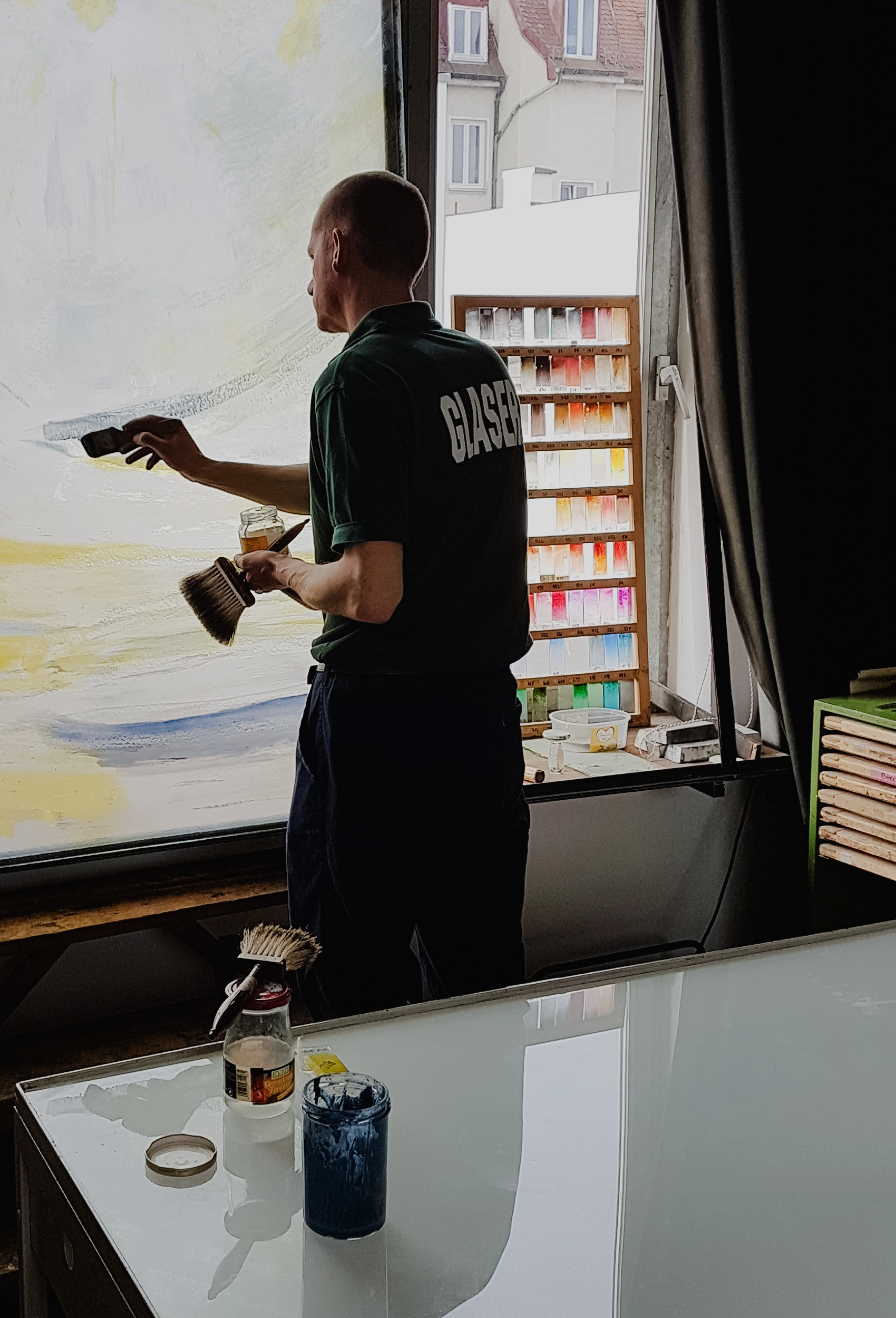 The calm before the storm' is the title of his stained glass window for the newly designed maternity ward at the St. Franziskus Hospital in Ahlen, which the glass painters at the van Treeck workshops created according to the artist's design using generous, bold brush strokes and structured firing.