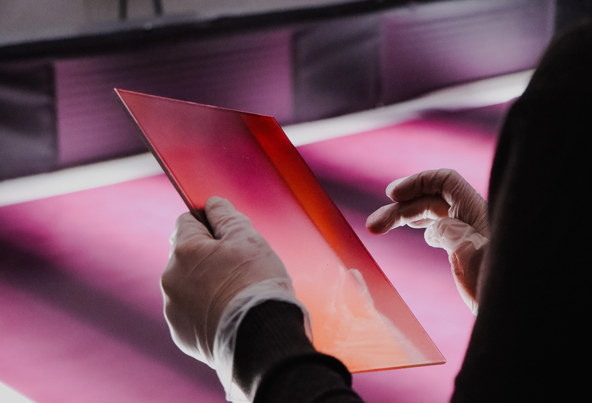 The large-format glass painting 'Red'n'Ball' was created for this purpose.The artistic concept of 'Red'n'Ball' is based on the idea of showcasing the contemporary craftsmanship of the workshops and bringing glass painting expertise to Venice. Based on Vasarely's idea of spatial illusion, the work features a sphere and a deep red-orange colour gradient in addition to the prescribed geometric pattern.