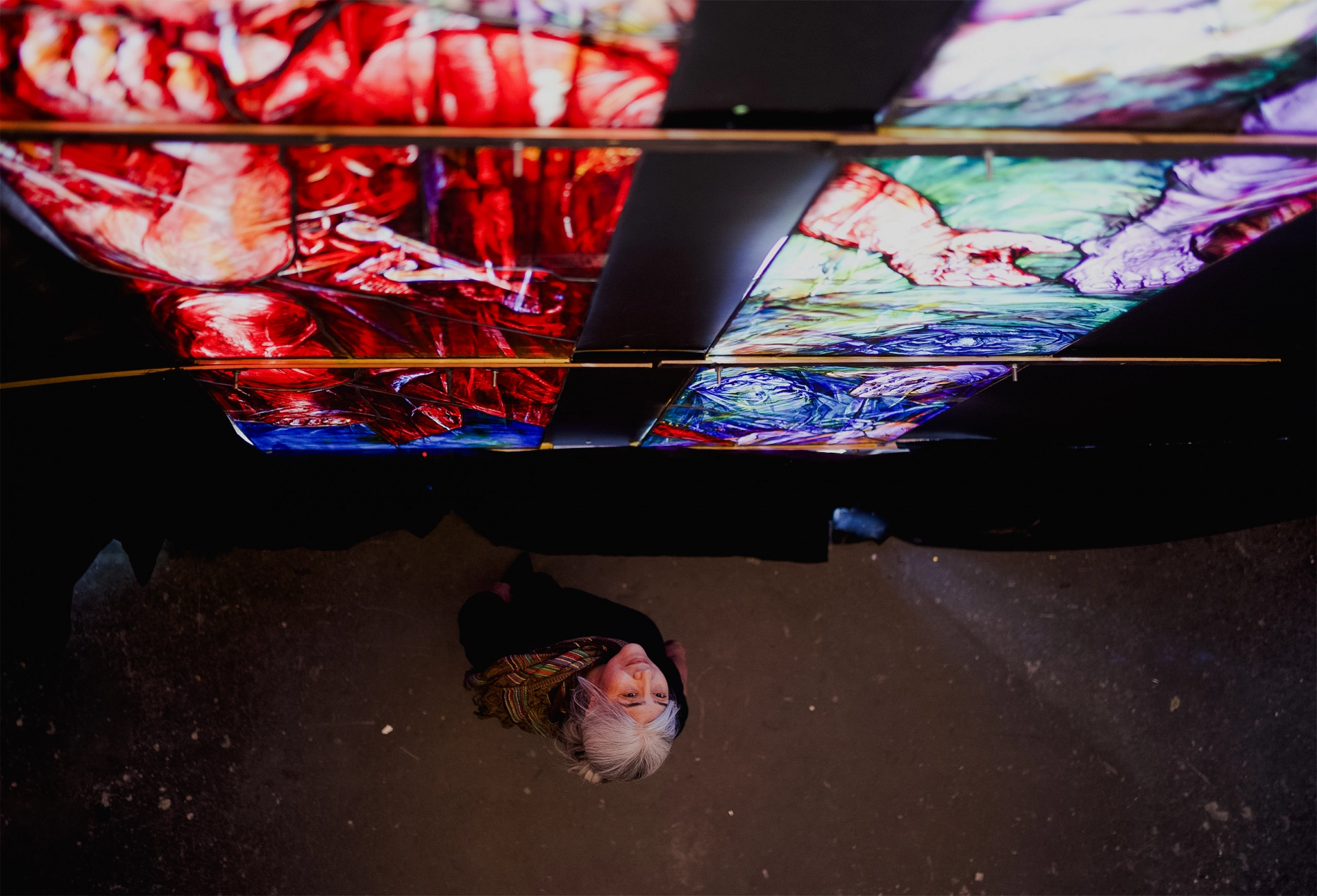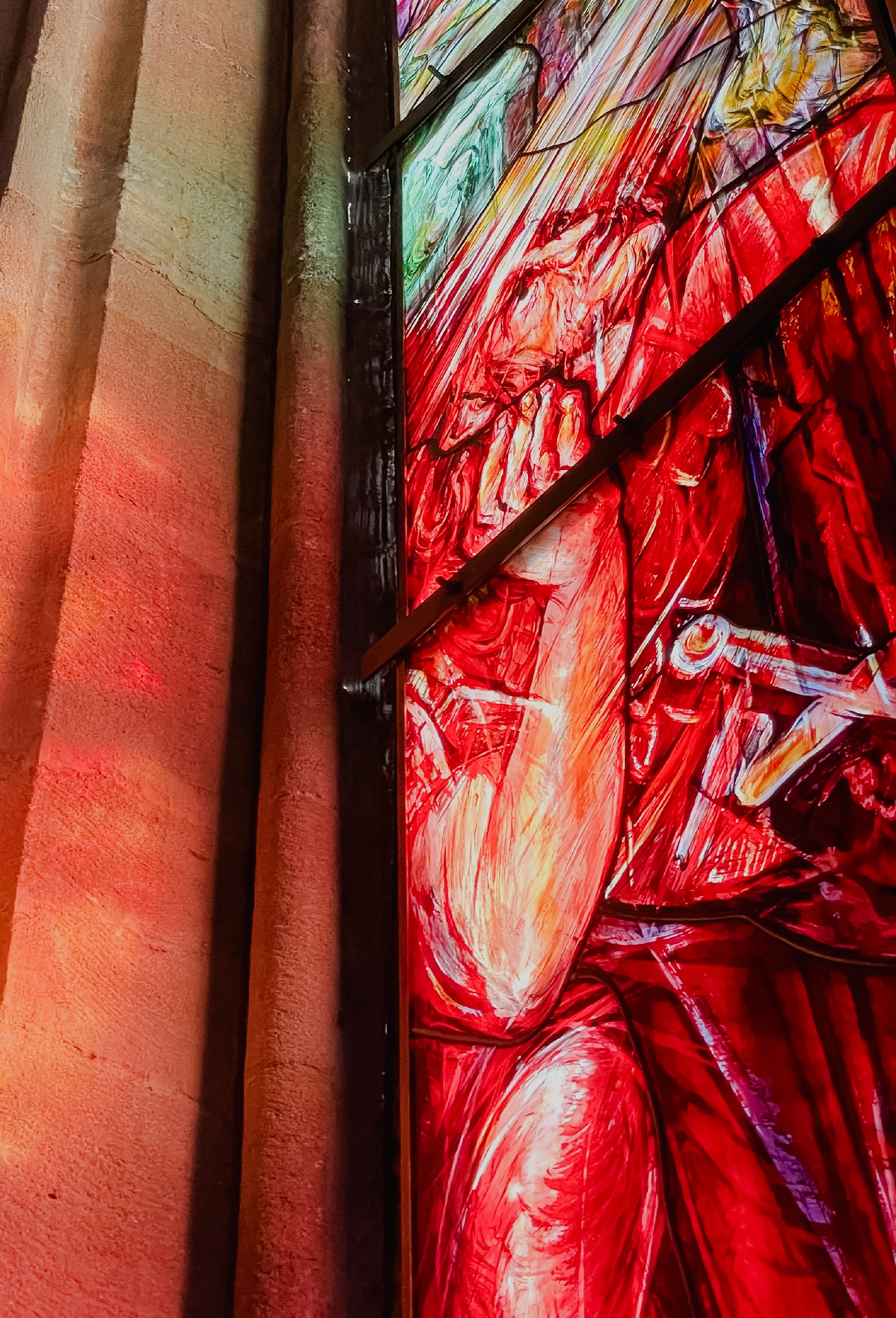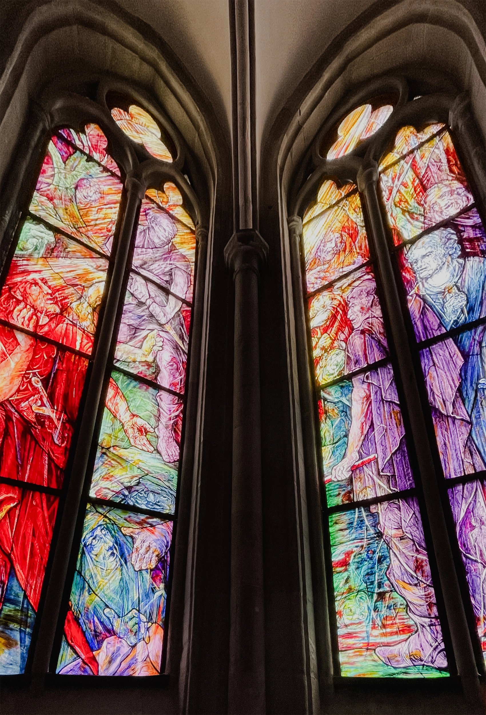 Munich-based artist Mahbuba Elham Maqsoodi designed and painted 29 of Tholey's 32 new stained glass windows. Her unique figurative paintings are well thought out and executed to perfection. The stage-like works move between the past, present and future. They depict themes and figures from the Old and New Testaments in an expressive yet enigmatic way, leaving their mark on the viewer of the Maqsoodi windows, who is moved by the powerful and graceful colours and the richness of the design.