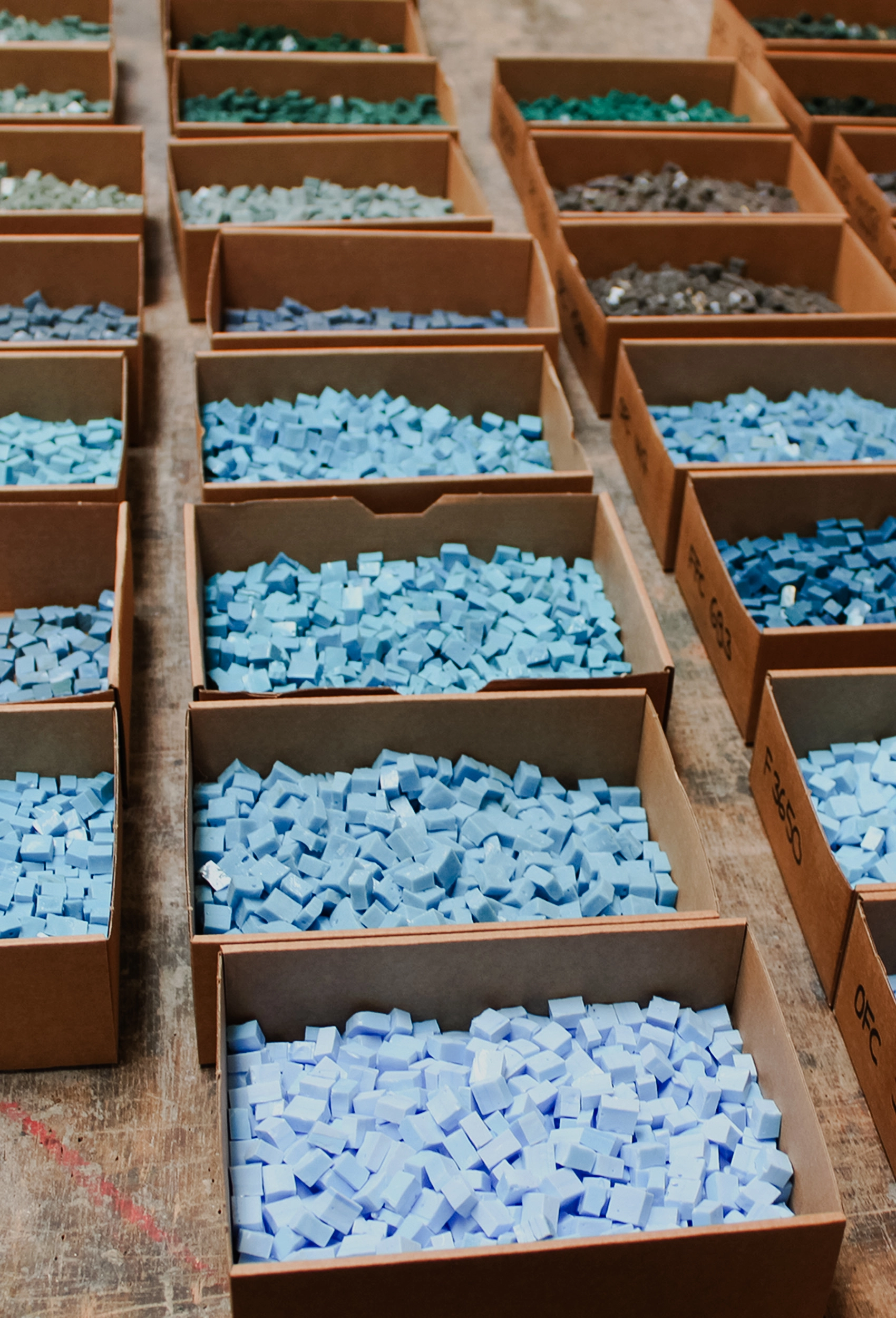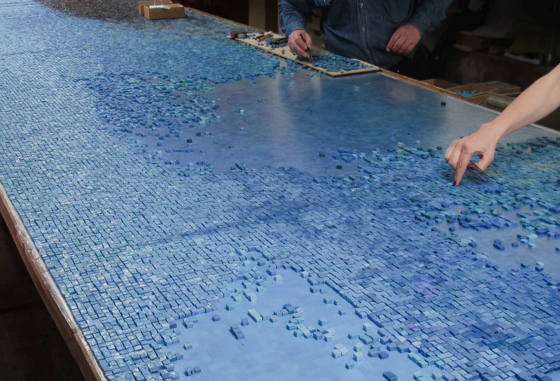 The two motifs, Il Ponte I and II, are composed of around 180,000 glass smalti and reproduce the pixels of the video artwork almost identically in colour. The workshops worked with the artist to select around one hundred different shades of colour, ranging from black and brown to purple, green and blue. Piece by piece, the mosaicists carefully assembled the coloured glass stones into the two harmonious motifs according to a precise template.