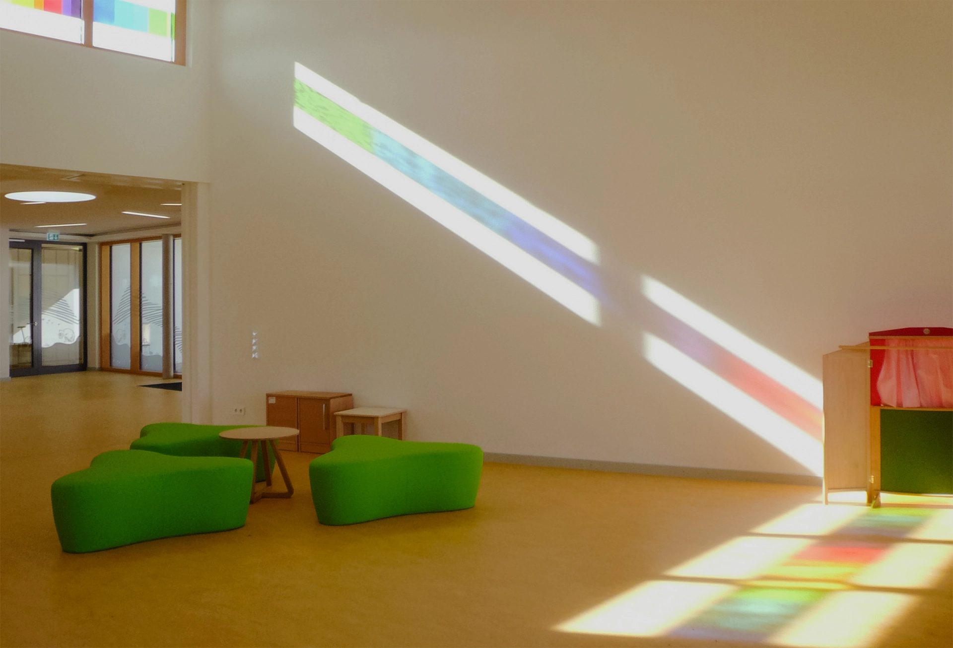 Like a rainbow, the light reflections fall through the window openings onto the wall and floor of the multi-purpose hall, conjuring up a loving atmosphere in the room. The concept was created by artist Heidi Bayer Wech.
