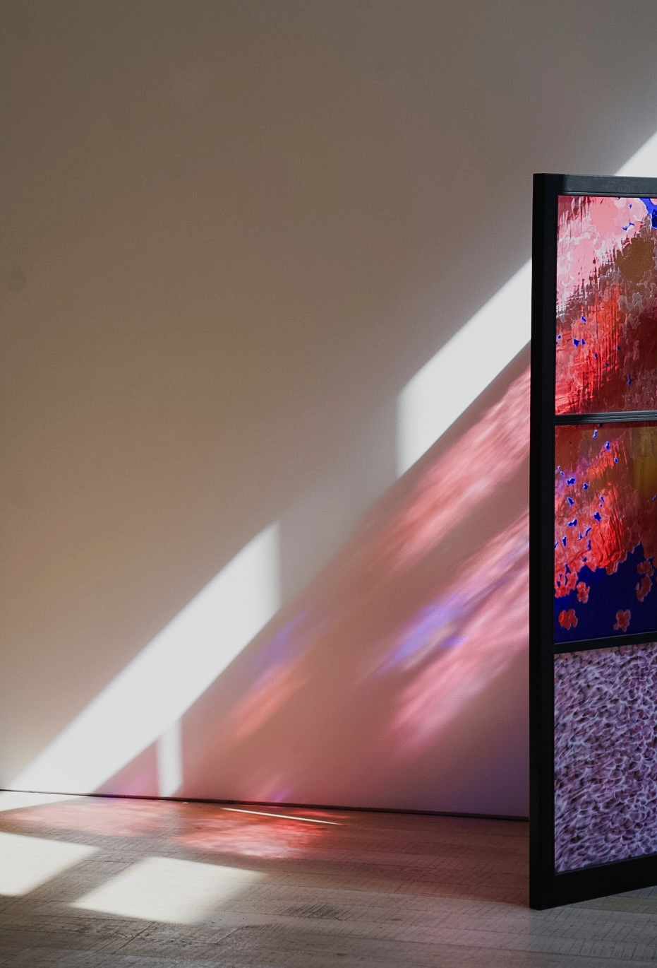 Die Glaseinsätze der Paravents bestehen aus mundgeblasenen Überfanggläsern. Die Glasmalerinnen bearbeiteten diese exakt nach künstlerischer Vorlage mit Siebdrucken und in Ätztechnik.