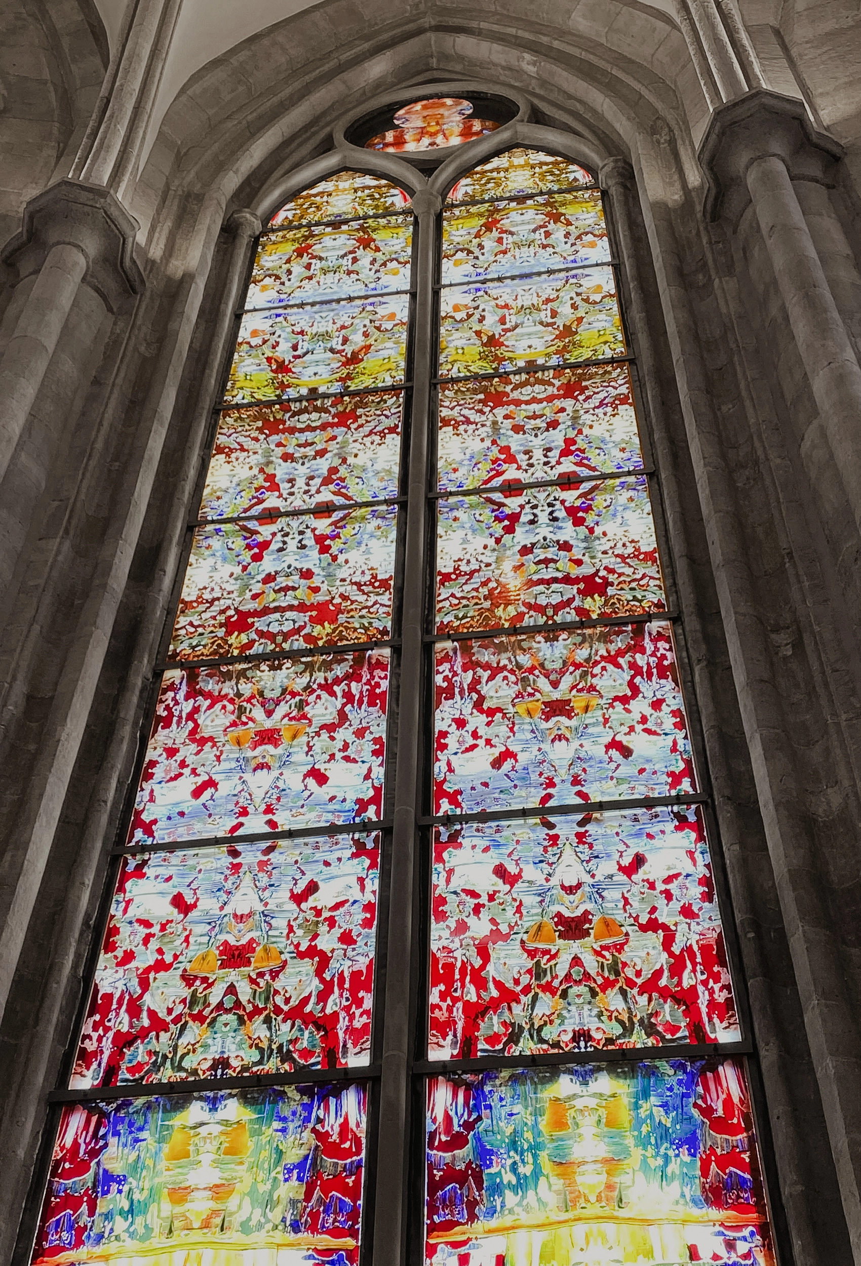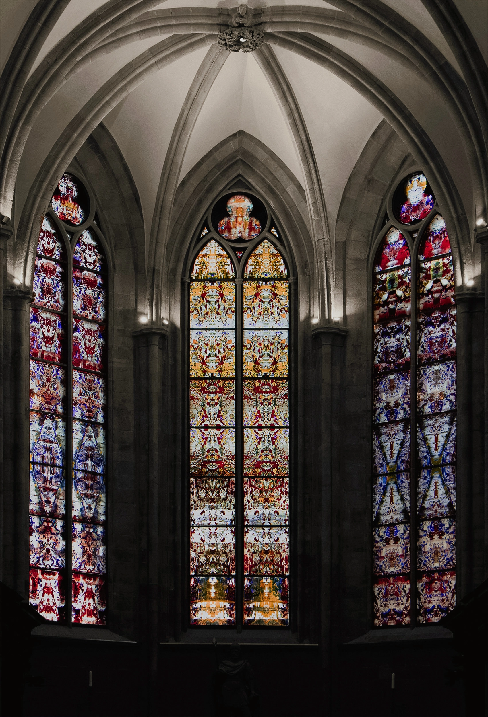 Die drei Chorfenster sind nach Vorlagen des weltberühmten Malers Gerhard Richter in den Münchner Werkstätten entstanden. Die Kirchenfenster basieren auf malerisch anspruchsvollen Vorlagen, die Gerhard Richter aus der 16-fach gespiegelten Serie seiner digitalen Arbeit für die Publikation “Patterns – Divided – Mirrored – Repeated” entnahm.
