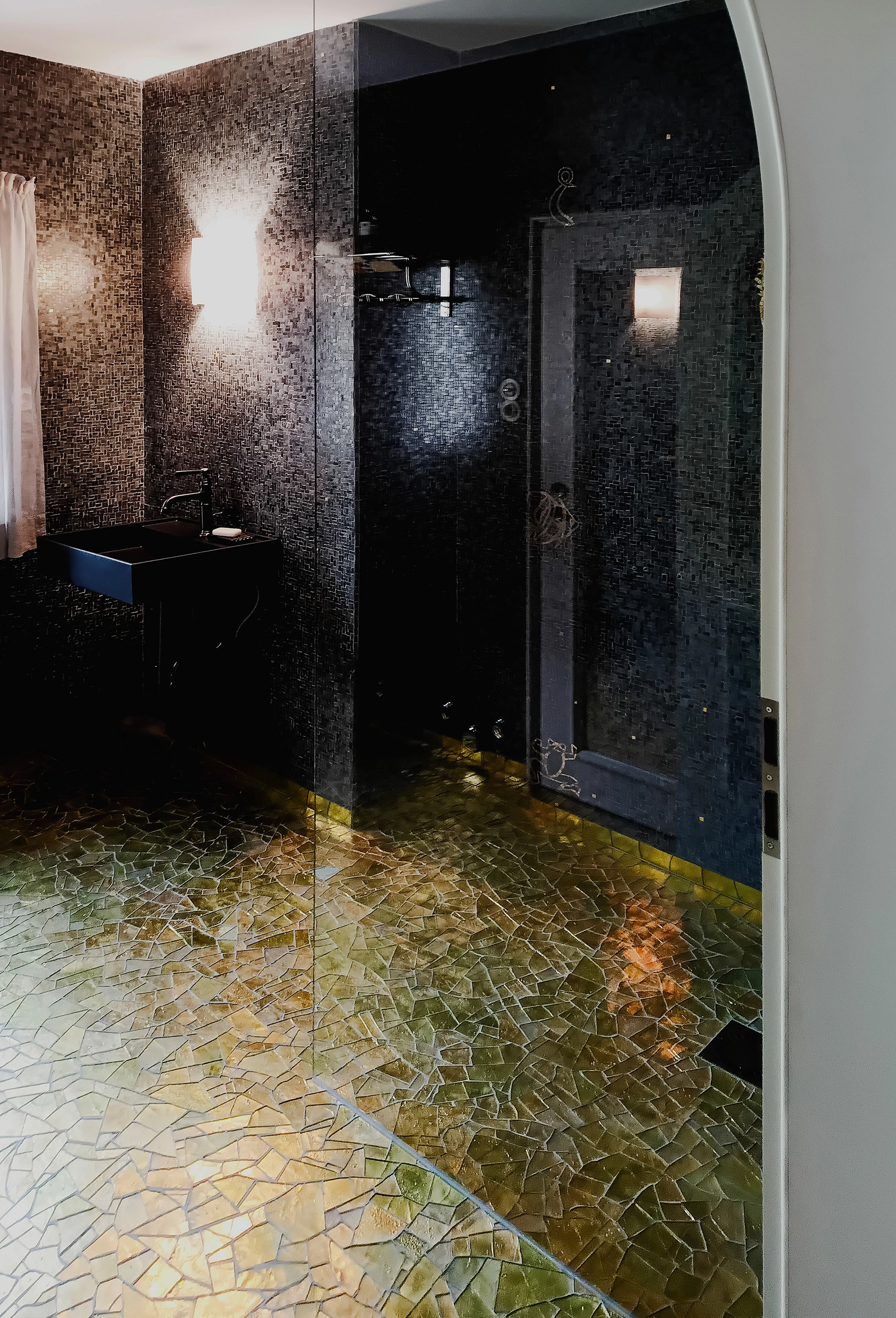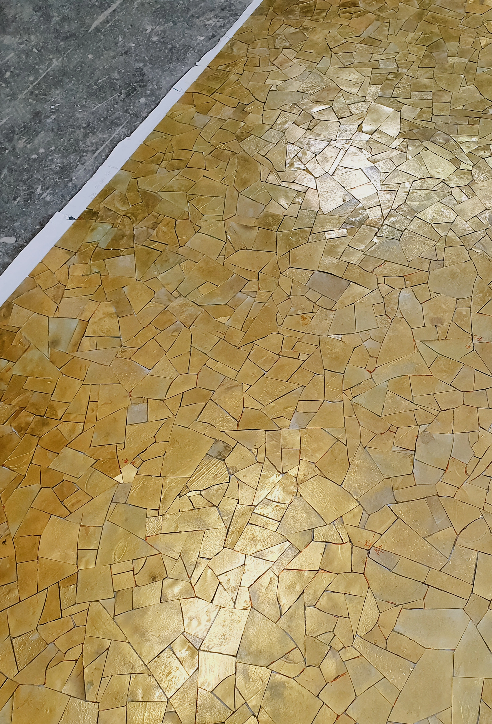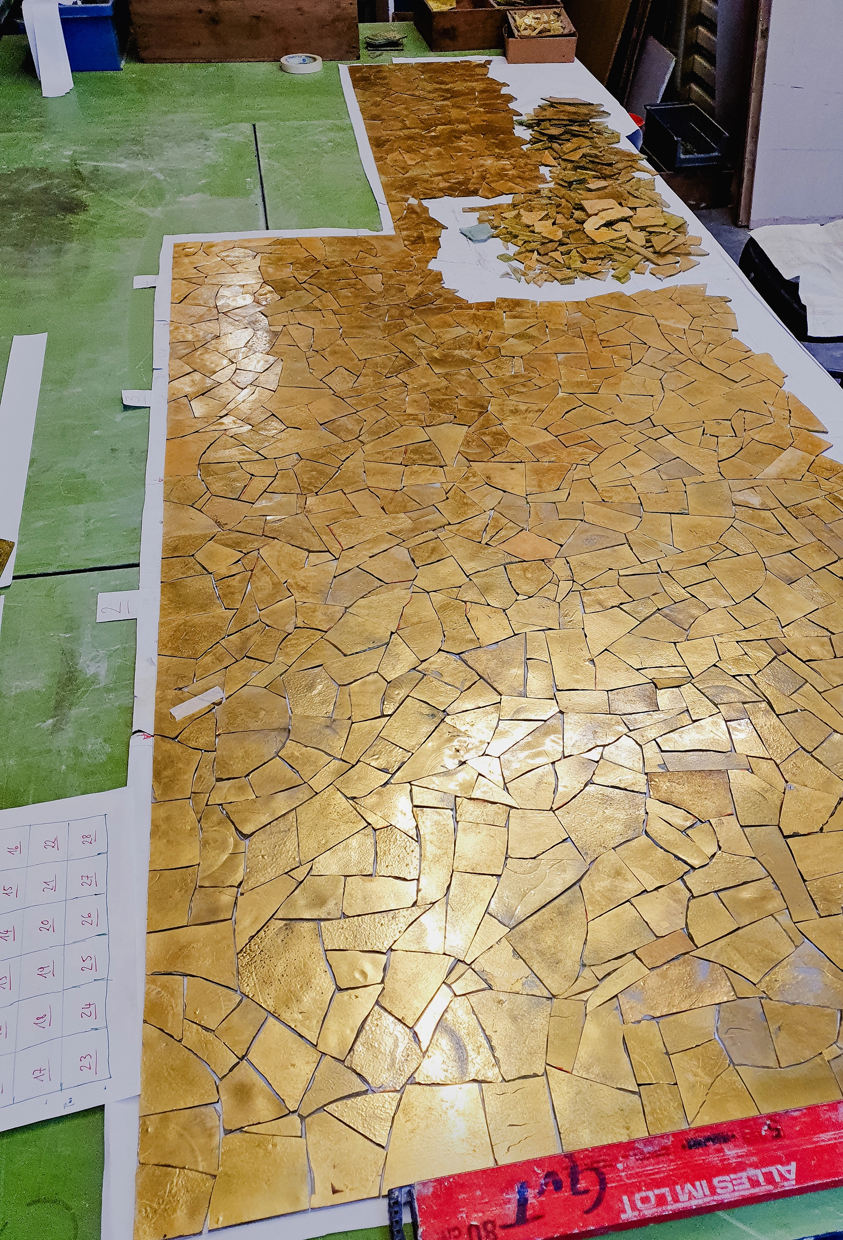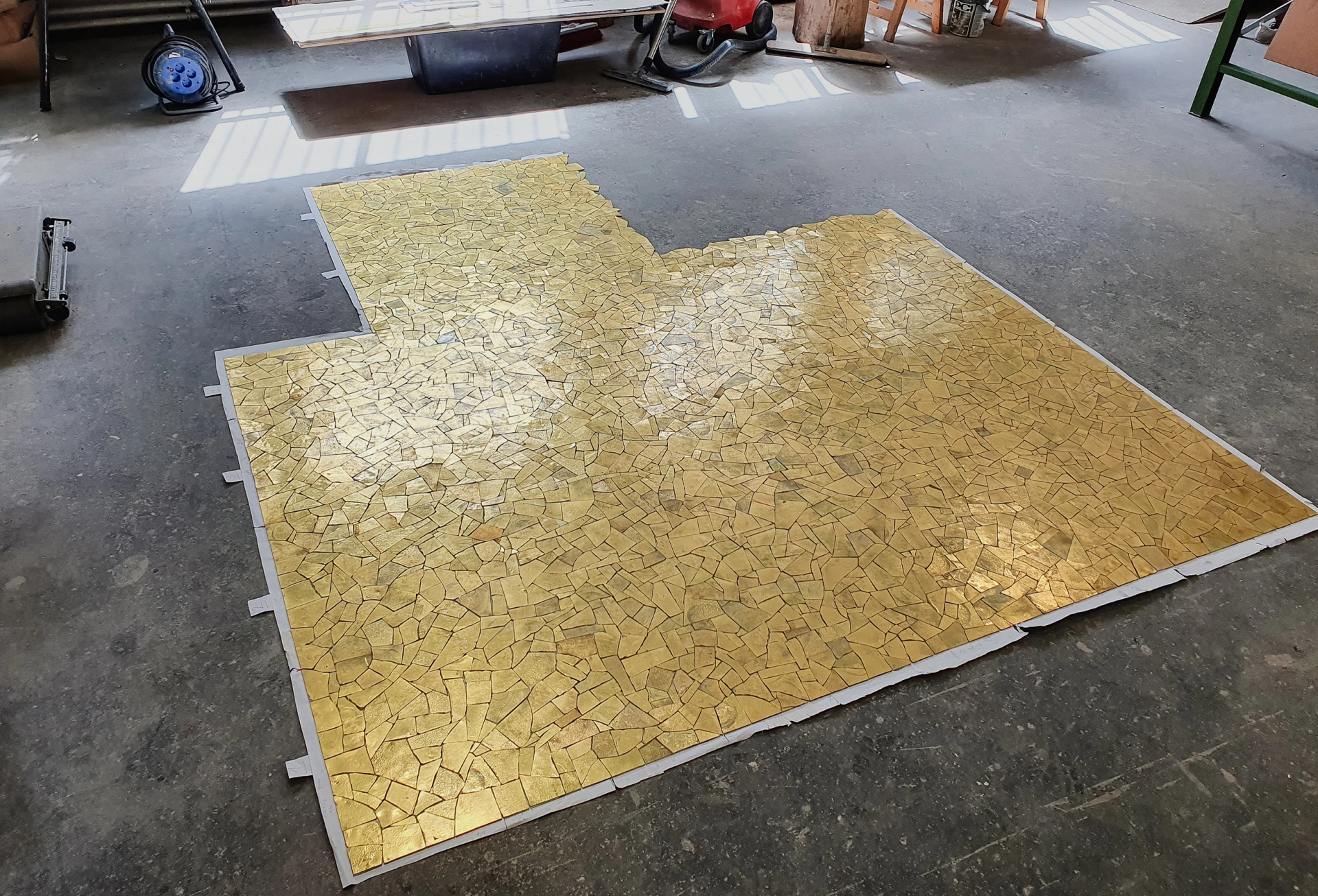 Für den exklusiven Spa-Bereich eines Allgäuer Privathauses schöpfen die Mosaizisten von VAN TREECK aus einem alten Bestand historischer Goldmaterialien im eigenen Kellerarchiv. Sie schneiden die ca. 10 x 10 cm großen Platten zu individuellen Stücken zurecht und legen sie malerisch zu einer Gesamtkomposition zusammen. Das fertige Goldmosaik wird schließlich auf dem Boden des Badezimmers verlegt und verfugt.