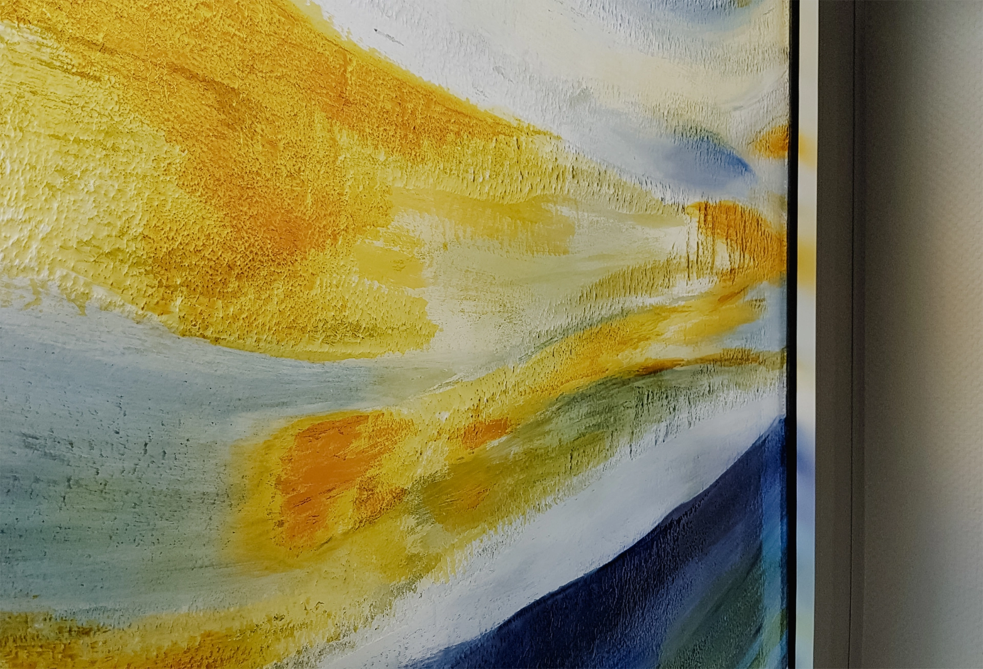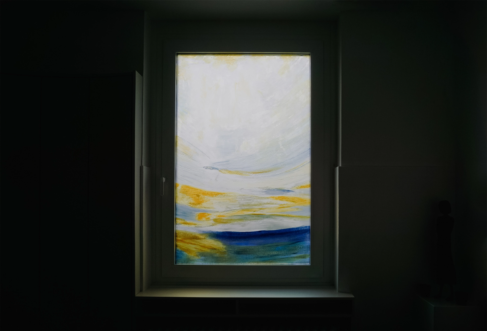 Mit großzügigen, beherzten Pinselgesten und Strukturbränden setzten die Glasmaler:innen der Werkstätten van Treeck das Werk nach Vorlage des Künstlers um. Das Ergebnis ist eine Ruhe stiftende, kontemplative Lichtarbeit für werdende Eltern und deren Nachwuchs.