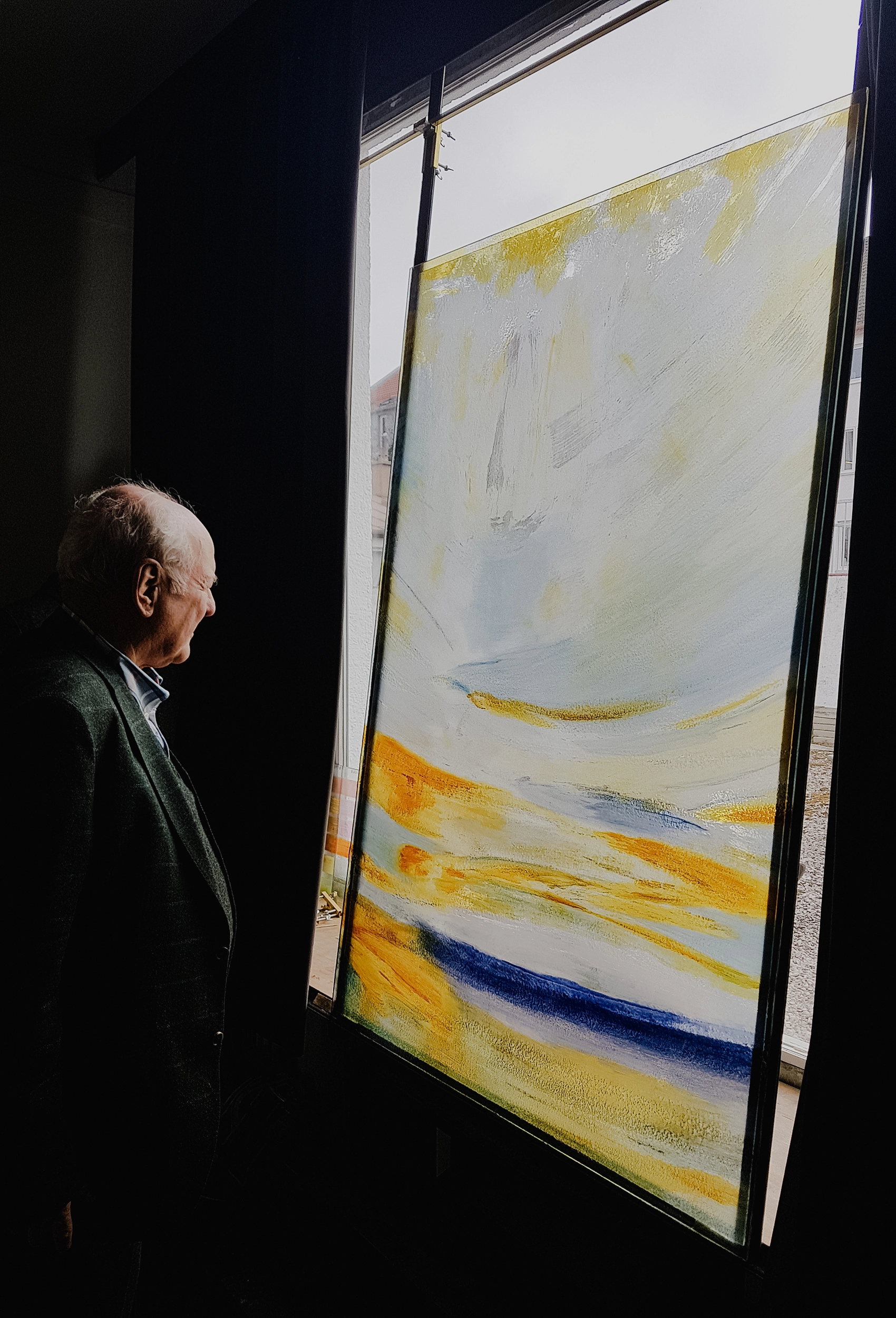 Prof. Claus Hipp schenkt Familien künstlerisch Ruhe und Geborgenheit: Für das Geburtsklinikum Ahlen hat der Münchner Künstler Nikolaus Hipp ein erstes glasmalerisches Kunstwerk kreiert. „Die Ruhe vor dem Sturm“ titelt er sein Künstlerfenster für den neu gestalteten Kreißsaal des Ahlener St.-Franziskus-Hospitals.