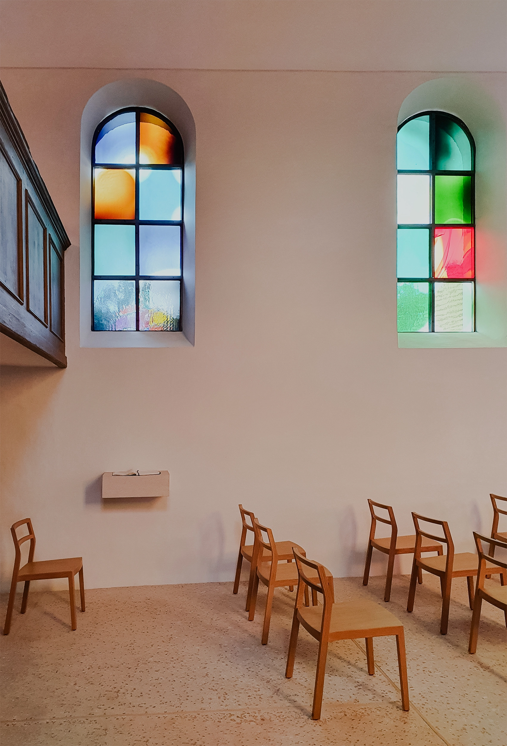 Es ist das erste Projekt, das der Farbmaler mit Glas realisierte. Dabei waren Farbharmonien, Raumwirkung, Lichteinflüsse und der historische Kirchenraum taktgebend für Entwurf und Entwicklung der Fenster. Die lange und sorgfältig ausgewählten Überfanggläser in unterschiedlichen Farbräumen bearbeiteten die Glasmalerinnen nach Direktiven des Künstlers in Ätztechnik. So entstanden in den Feldern harmonische Formen in unterschiedlichen Farbnuancen. Im Oktober 2020 wurden die Künstlerfenster eingeweiht.