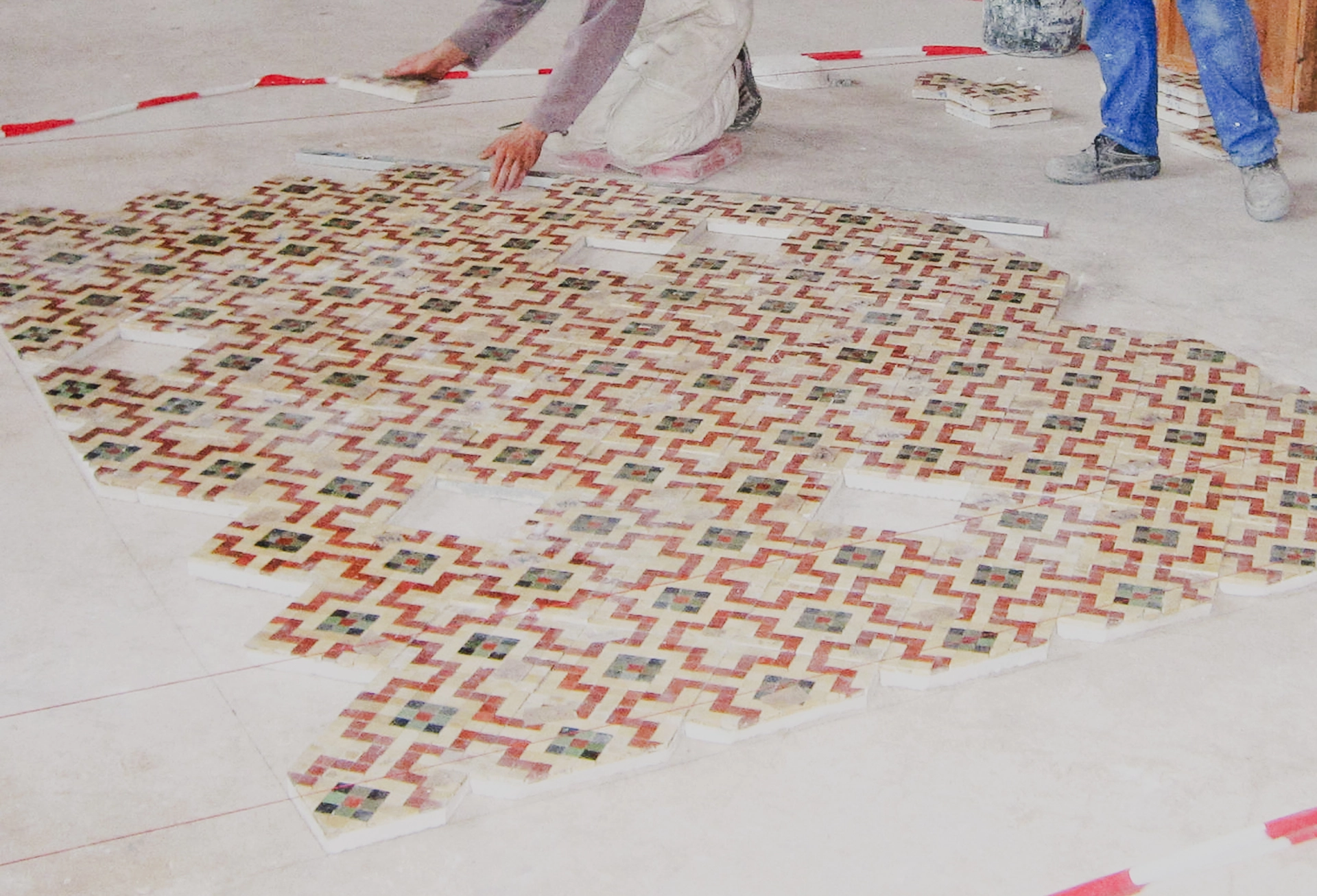 Gut die Hälfte der Fläche wurde dabei konserviert, die andere Hälfte wurde nach historischem Vorbild aus handgegossenen eingefärbten Gips-Kalk-Sand-Würfeln nachgelegt. Diese wohl größte Denkmalbaustelle des Bundes in der Hauptstadt beschäftigte die Restauratorinnen und Restauratoren des Betriebs van Treeck mehr als 2 Jahre lang.