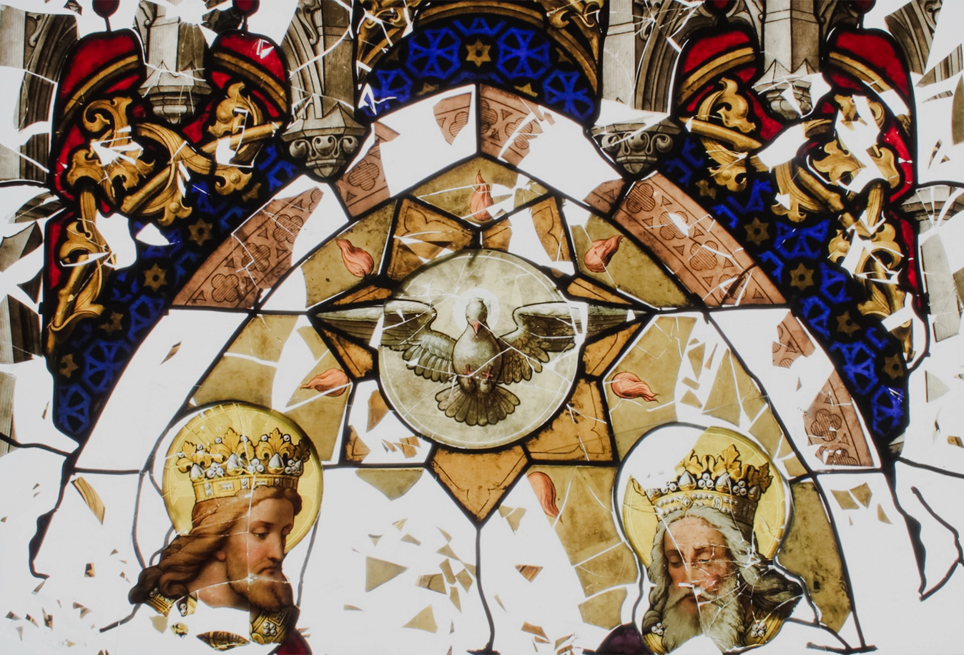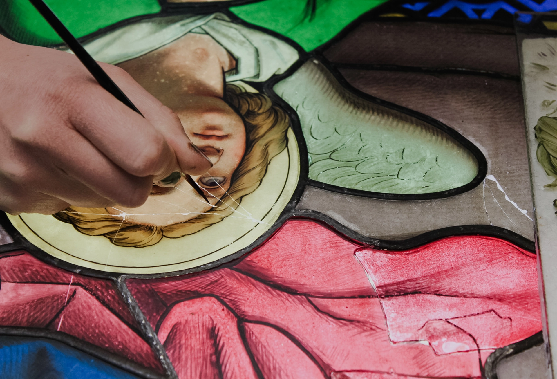 In akribischer Tüftelarbeit fügten die Werkstattmitarbeiter:innen die Glassplitter zusammen und verklebten sie. Die Klebungen retuschierten sie, Fehlstellen ergänzten sie glasmalerisch. Die Bleinetze festigten und ergänzten sie. So erhielten sie möglichst viel der Originalsubstanz. Die fertigen Felder rahmten die Kunstglaser:innen und montierten sie schließlich vor einer isothermischen Außenschutzverglasung.