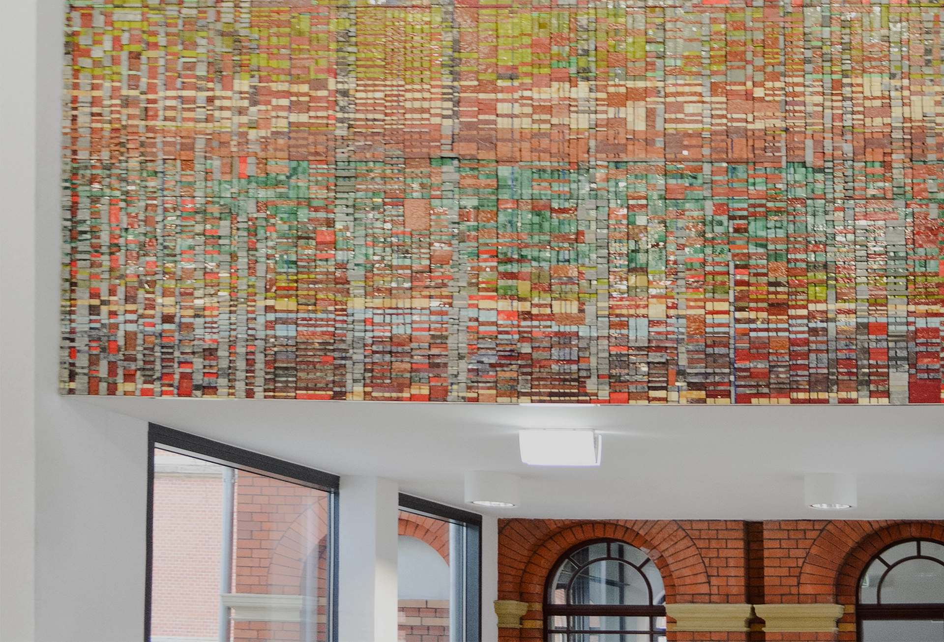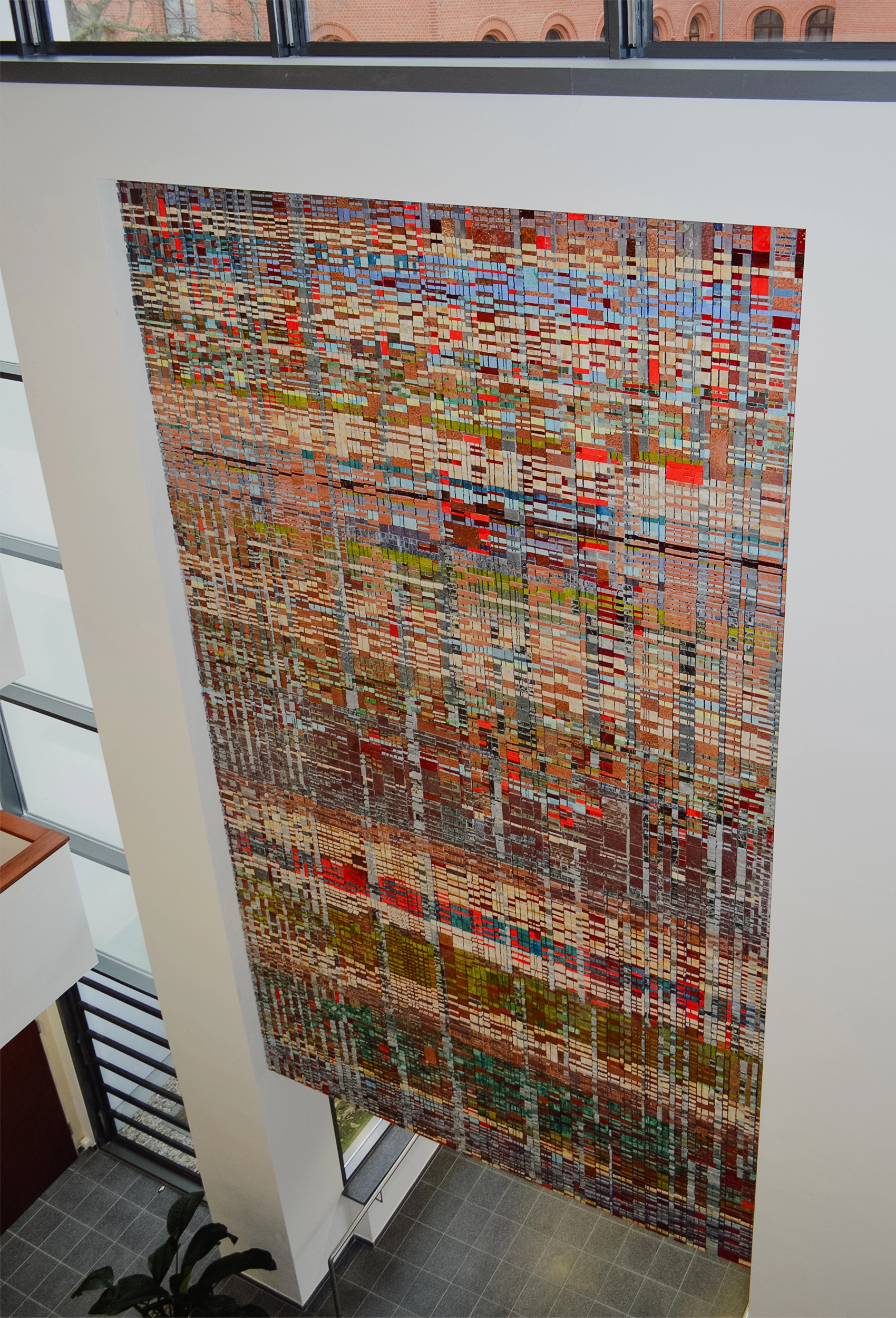Bunte Rechtecke aus Glas und Natursteinen fügen sich zu einem abstrakten Bild zusammen: Das Wandmosaik im Foyer des Internationalen Begegnungszentrums (IBZ) ist das Ergebnis eines Wettbewerbs zu Kunst am Bau an der Uni Halle.