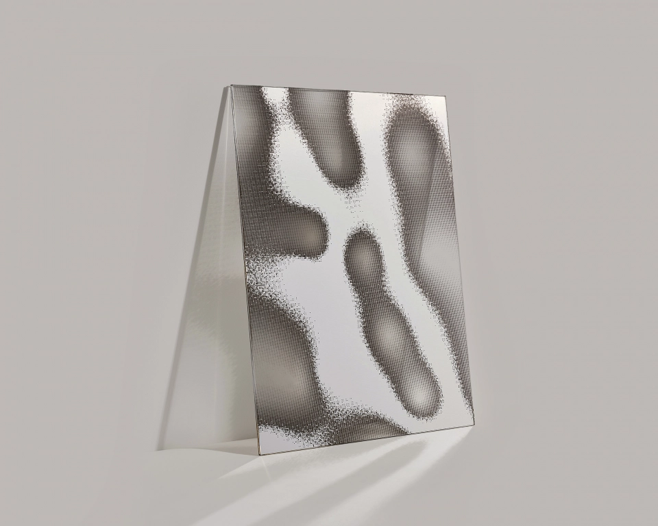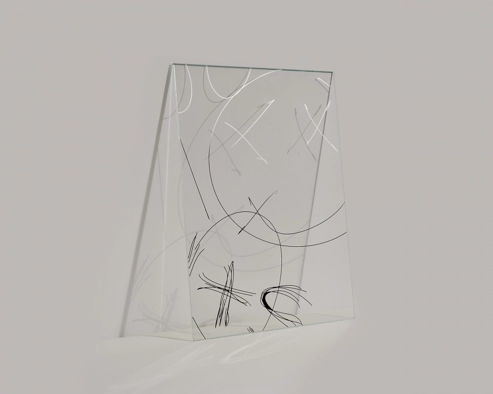 Von Hand geschaffene, transparente Muster gestatten einzigartige Durchblicke zwischen zwei Räumen. Gleichzeitig spiegelt sich die Umgebung auf dem Glas. Design von Garth Roberts.