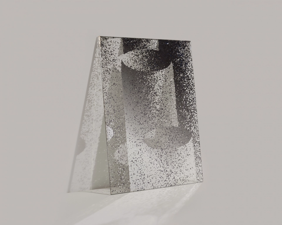 Aquarellmotive verwandeln sich in geheimnisvolle Wolken auf Glas. Zusätzlich imitiert eine Spiegelschicht die Bewegung des Wassers. Design von Elisa Strozyk.
