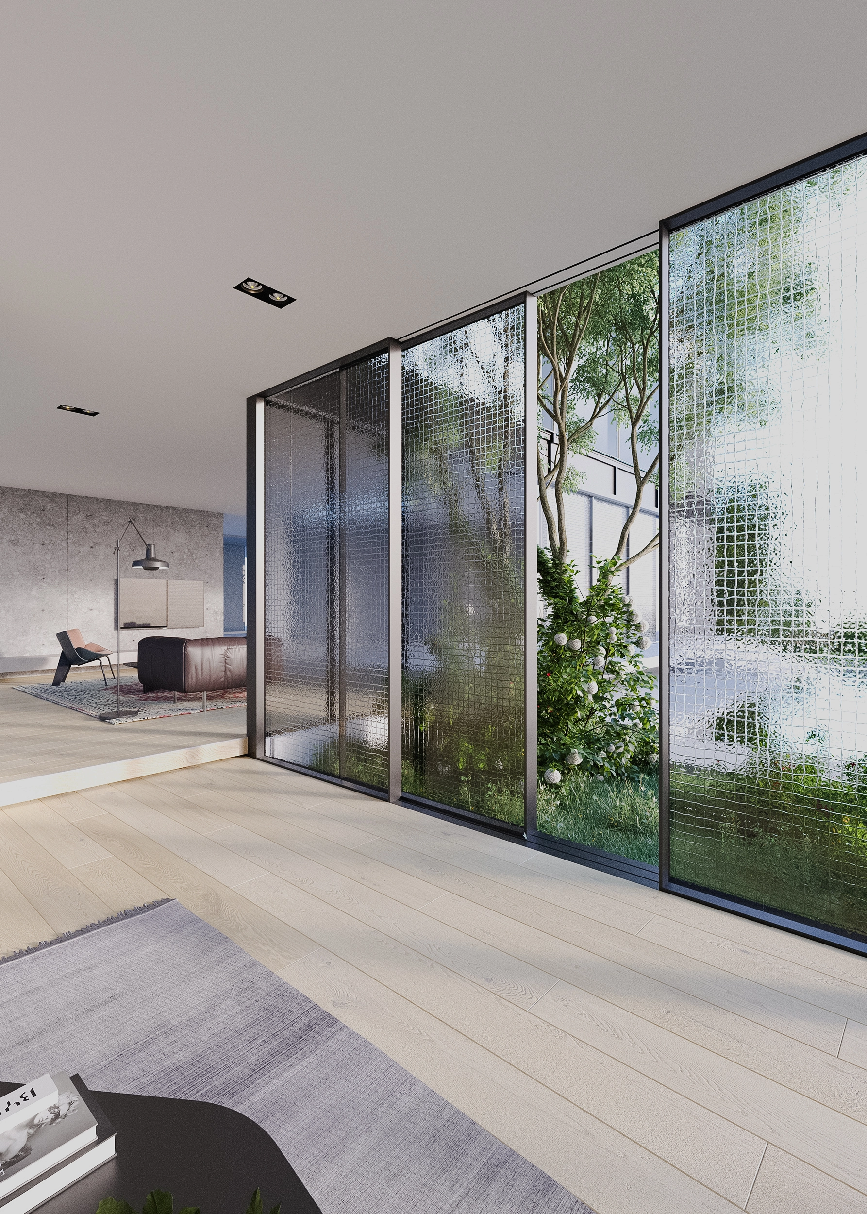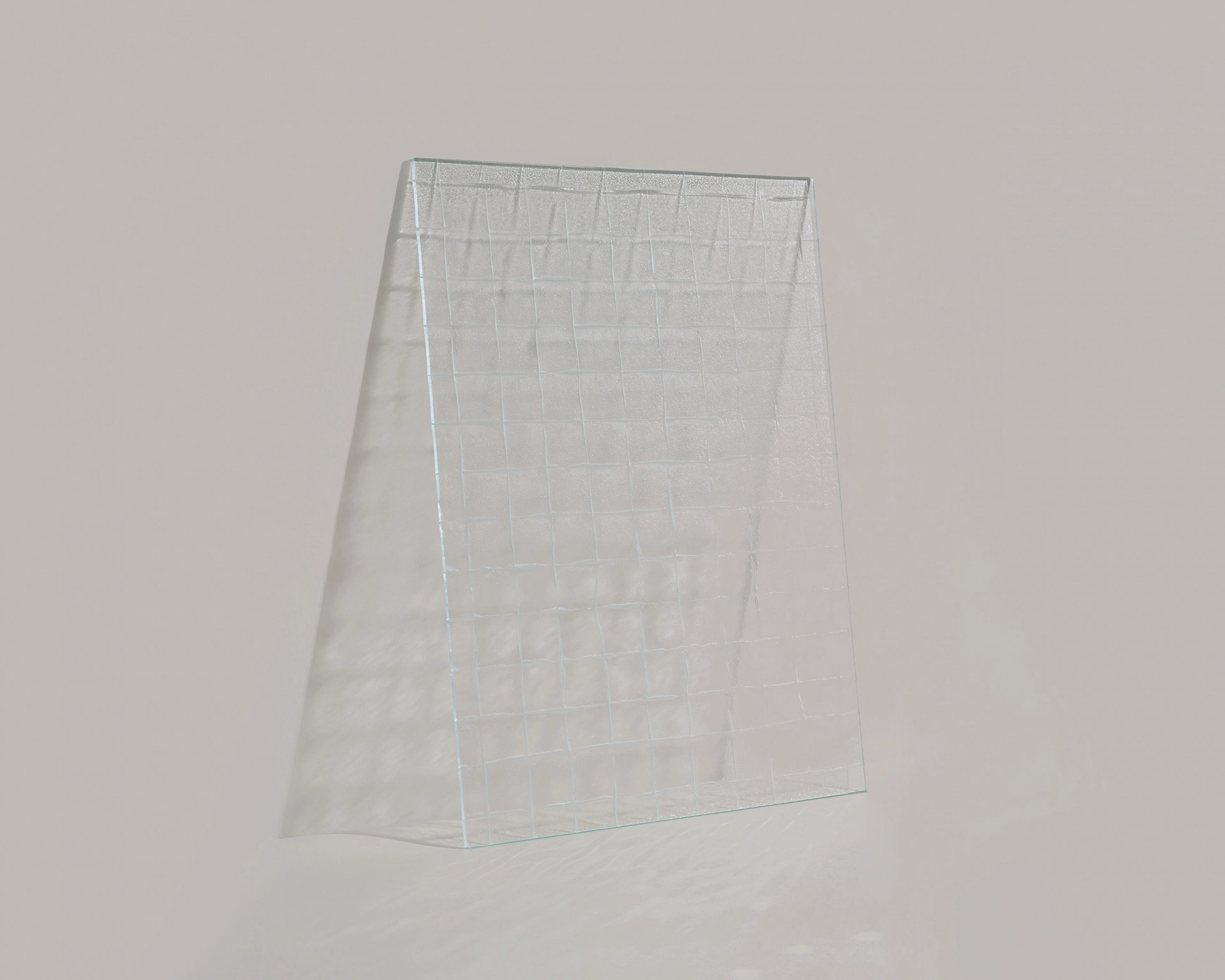 Eine Hommage an die filigranen Muster von Drahtglas und gewebtem Stoff. Die feinen Strukturen auf der Glasoberfläche, die durch das sogenannte Fusing-Verfahren entstehen, beschreiben die Besonderheiten dieser Materialien in ihrer ganzen Tiefe .